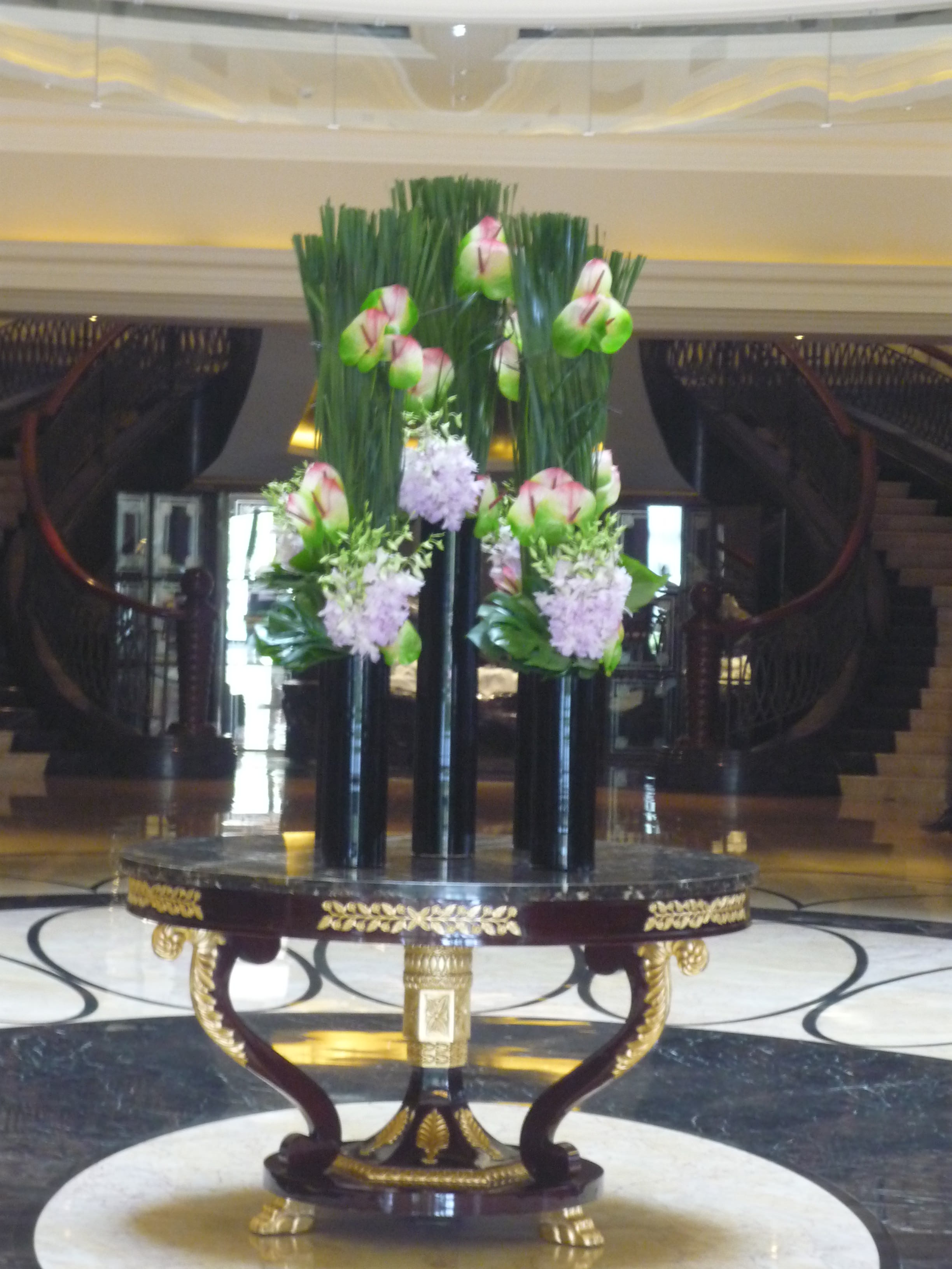 We were invited inside by the door man (I think that was because I was wearing a dress and had a tasteful floral sun hat on), so we had a chance to have a look at the sumptuous atrium, with its grand floral display: