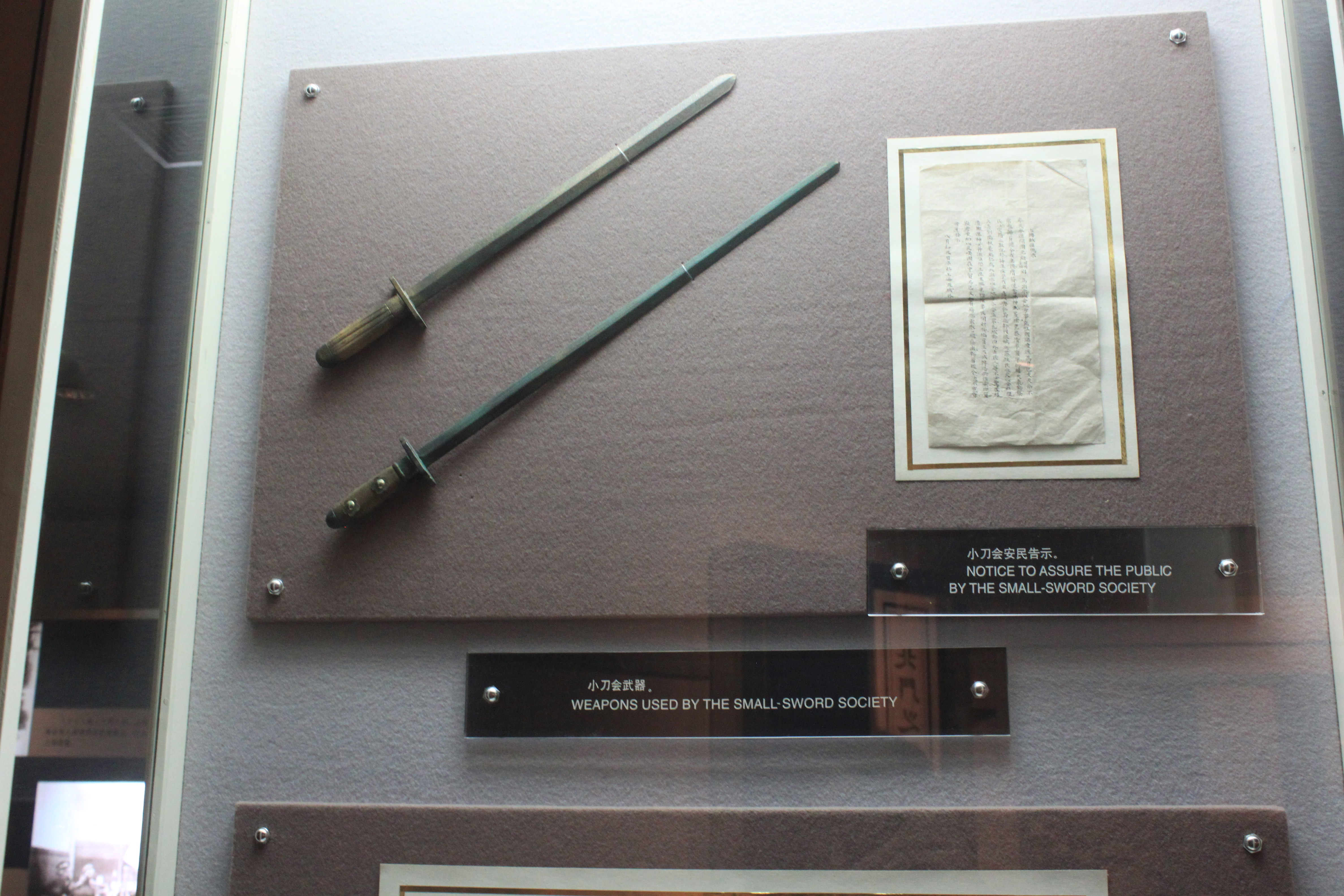 These are photographs of communists that had been killed. But then the exhibition went into a little bit of the history of Shanghai with this summary of Britain’s role and a military costume, followed by a couple of small swords from the Small Sword Society, together with some photographs of Old Shanghai and pictures of Zhou Enlai and others in Paris in 1924 :