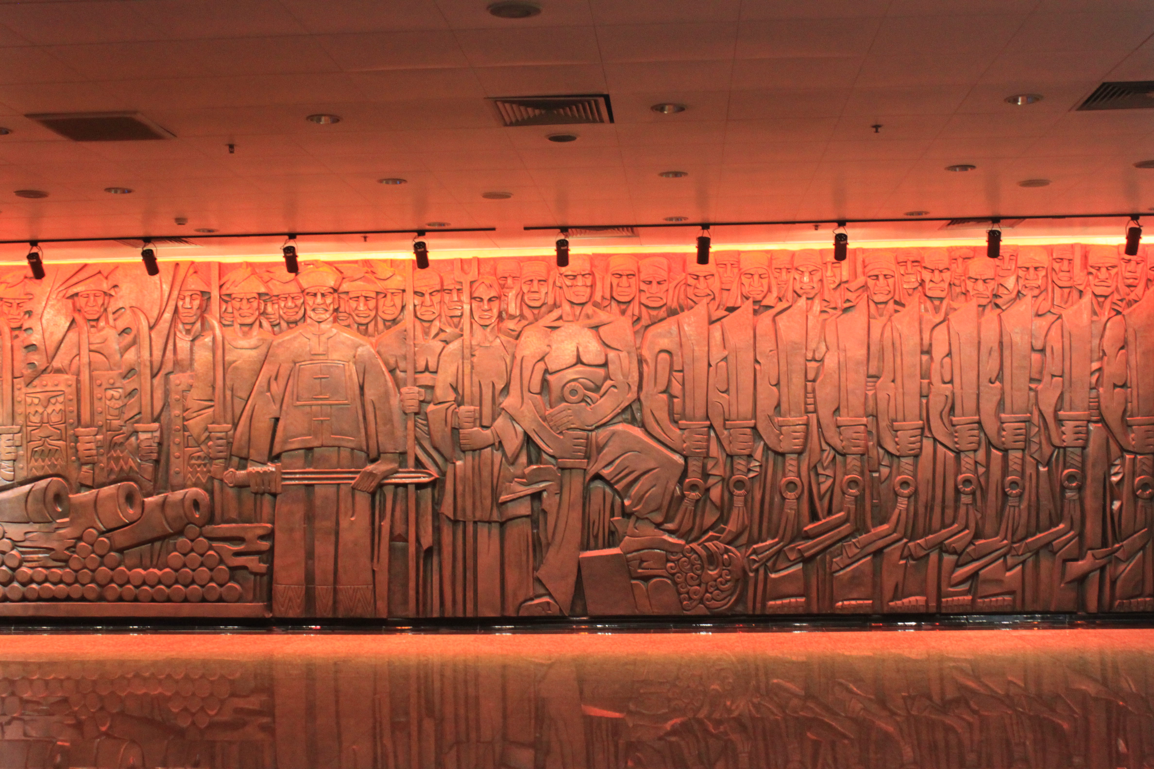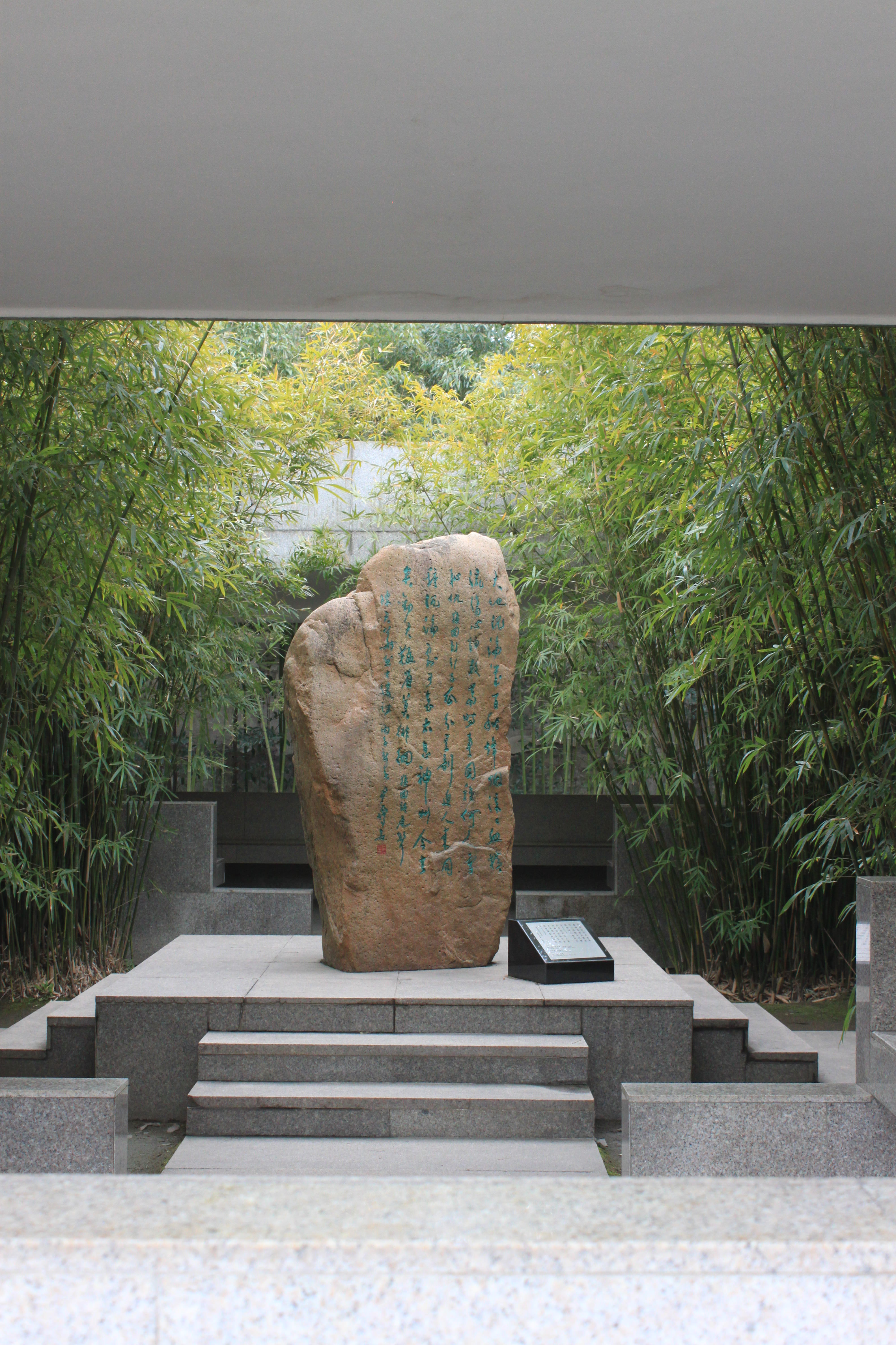 To one side of the main axis is a Steles Garden with stone slabs or stele standing in amongst stands of bamboo or concrete monuments, or as carved into the 50 meter long stone walls of the garden that were very serene and in marked contrast to aggressive soviet-style sculptures elsewhere. And a part of the park I really loved. Some 90 revolutionary poems and articles are inscribed on these stele, some written by those who had been killed.