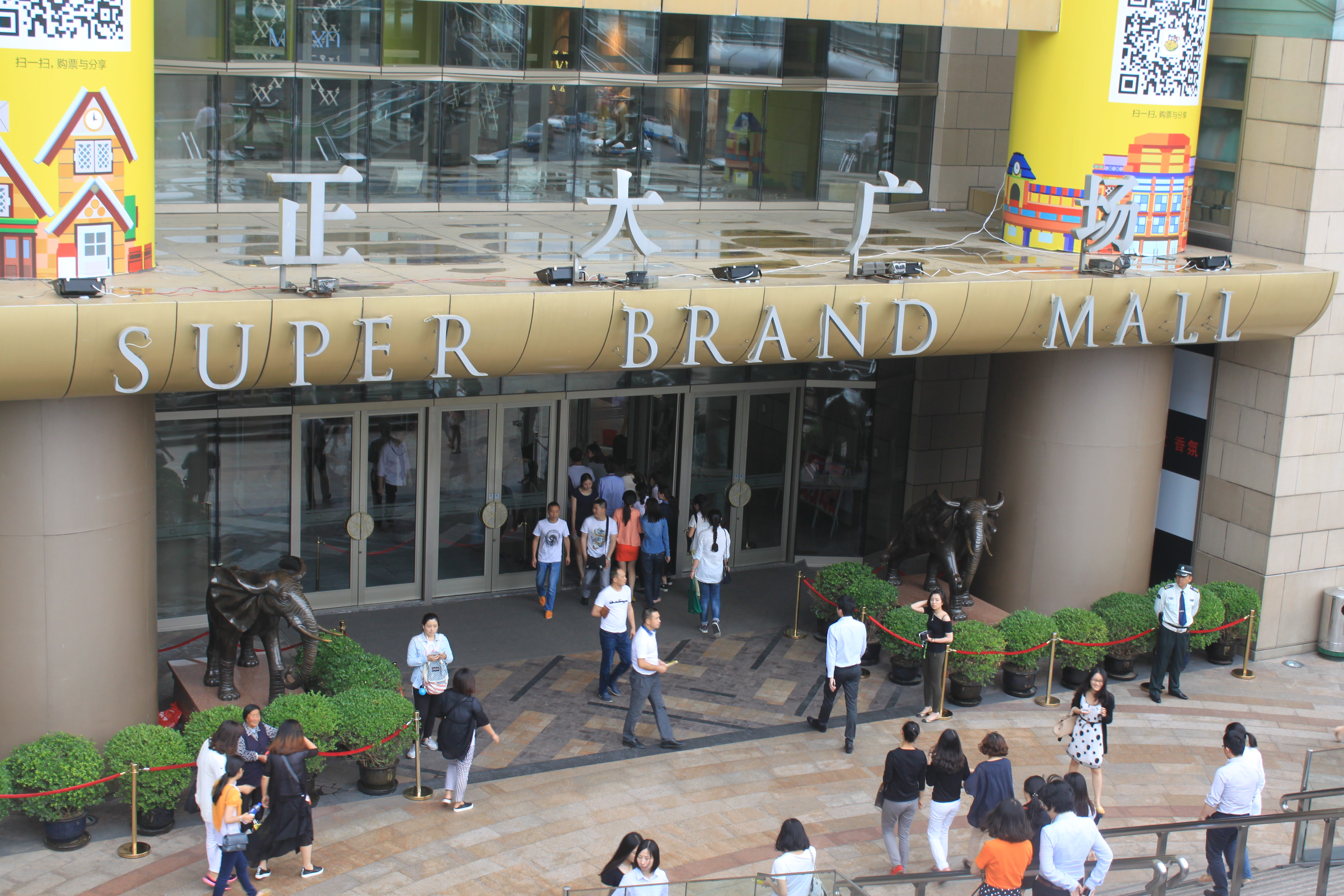 We started, however, with lunch – taking this overhead pedestrian roundabout (there are number of these being built at major intersections in Shanghai), passing on one side the local Disney store with its Mickey Mouse floral display and on the other, yet another of the Shanghai Apple Stores , to the rather ugly Super Brand Mall building, a mecca for designer labels and Chinese stomachs.