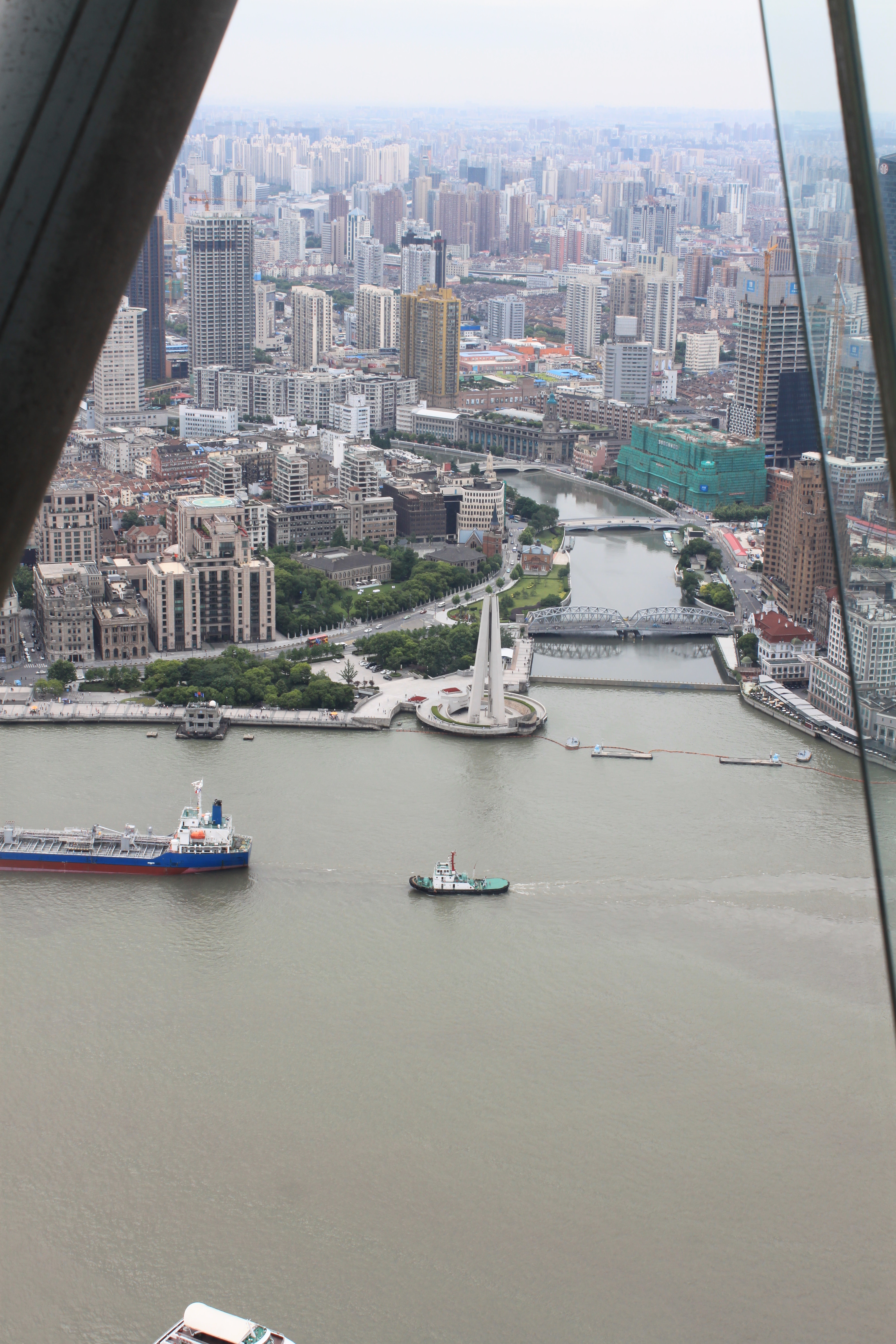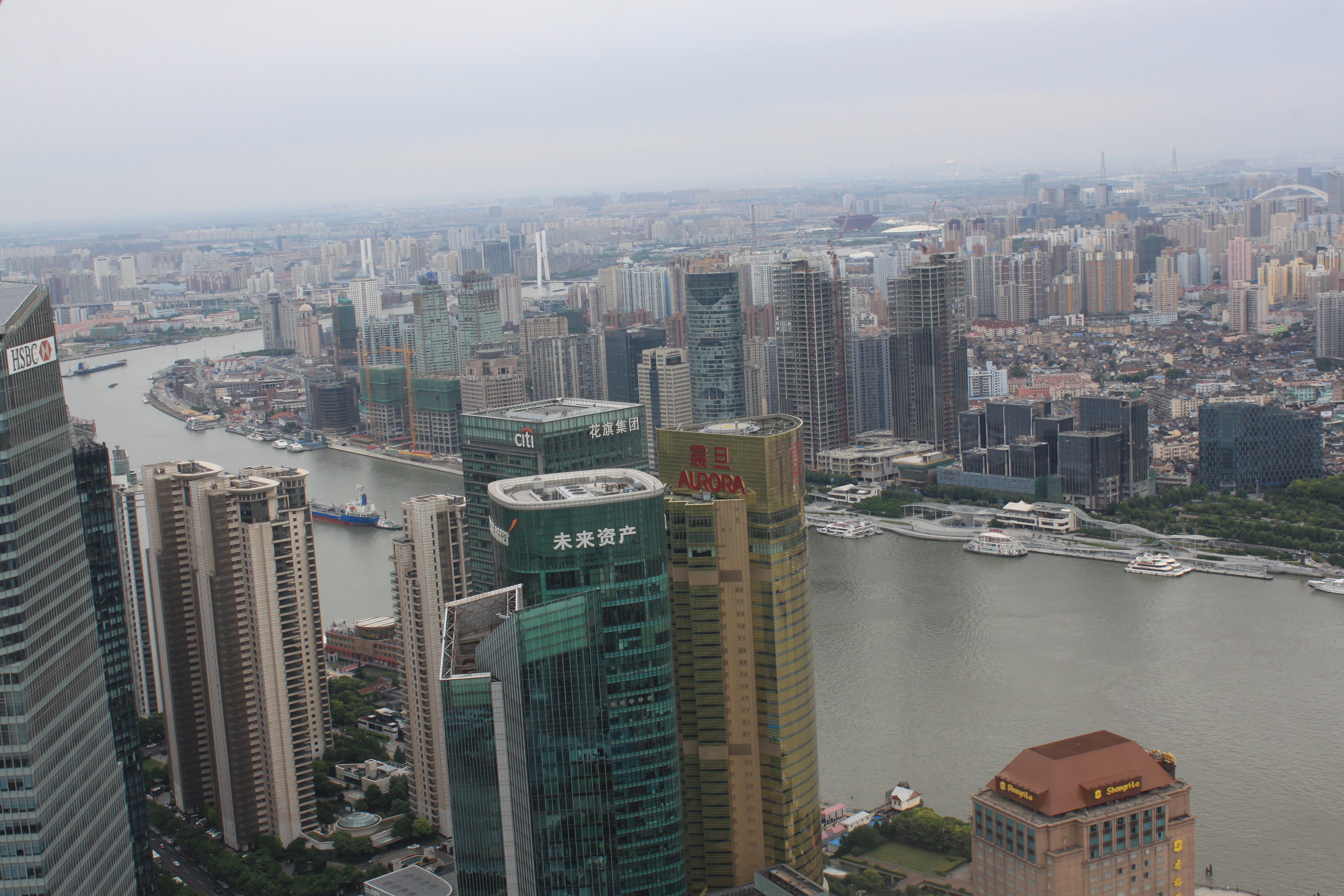 sits on the Huangpu river, a tiny tributary at the mouth of the mighty Yangtze River – the biggest in China. This tiny tributary, however is capable of taking ocean going liners and other sizeable cargo vessels. I took several photos of the views from the top sphere that we visited starting at about 11 o’clock and turning anti-clockwise: