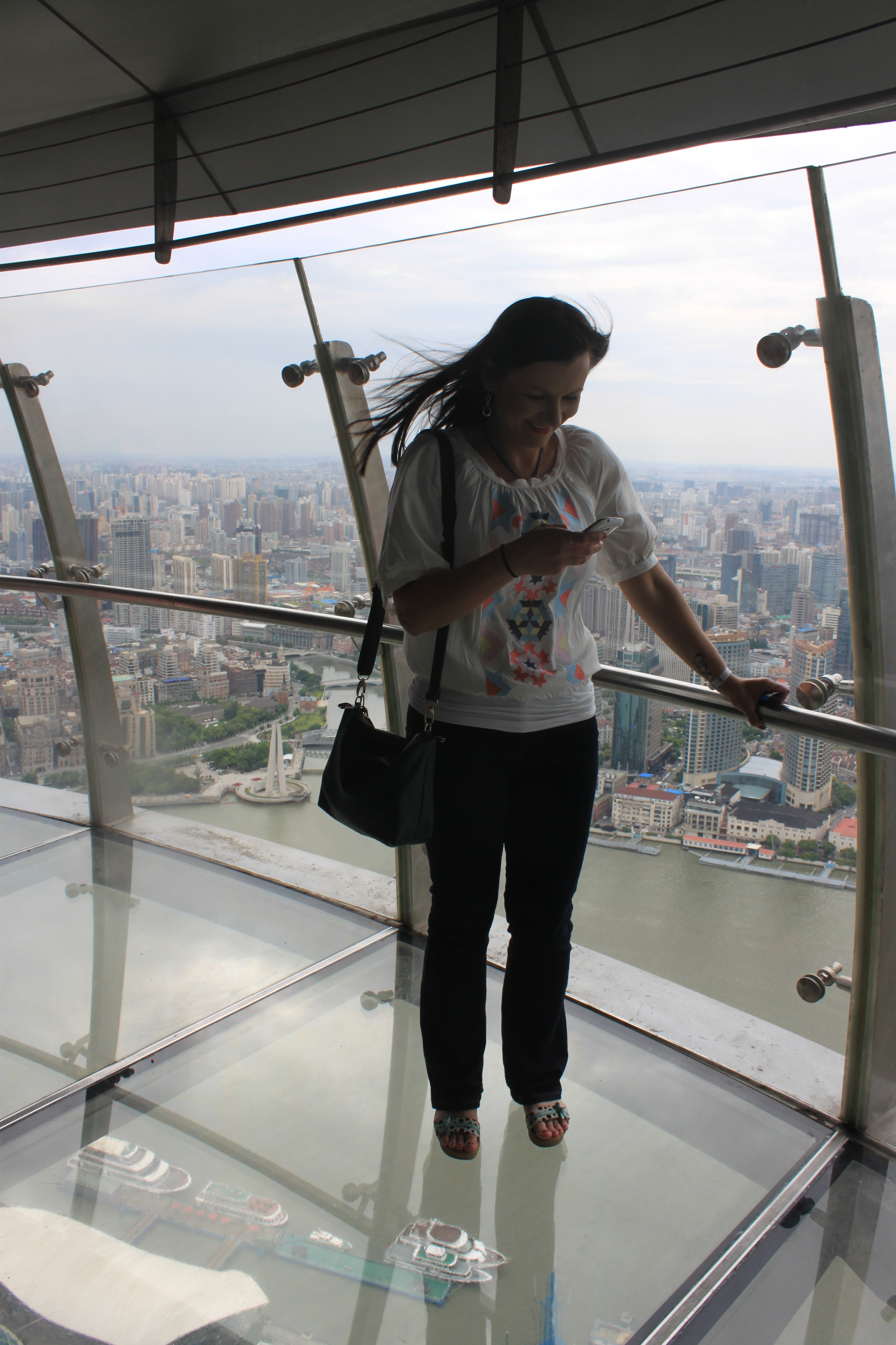 Much more impressive than these people lying down was the little boy who was lying face down……. (but I didn’t get my camera out in time). I took some photographs as I stood looking down through the glass, this one on the right looking back down at the base tower from the outside edge of the viewing platform was a little disconcerting, a bit like looking at the Earth from Space I should imagine.