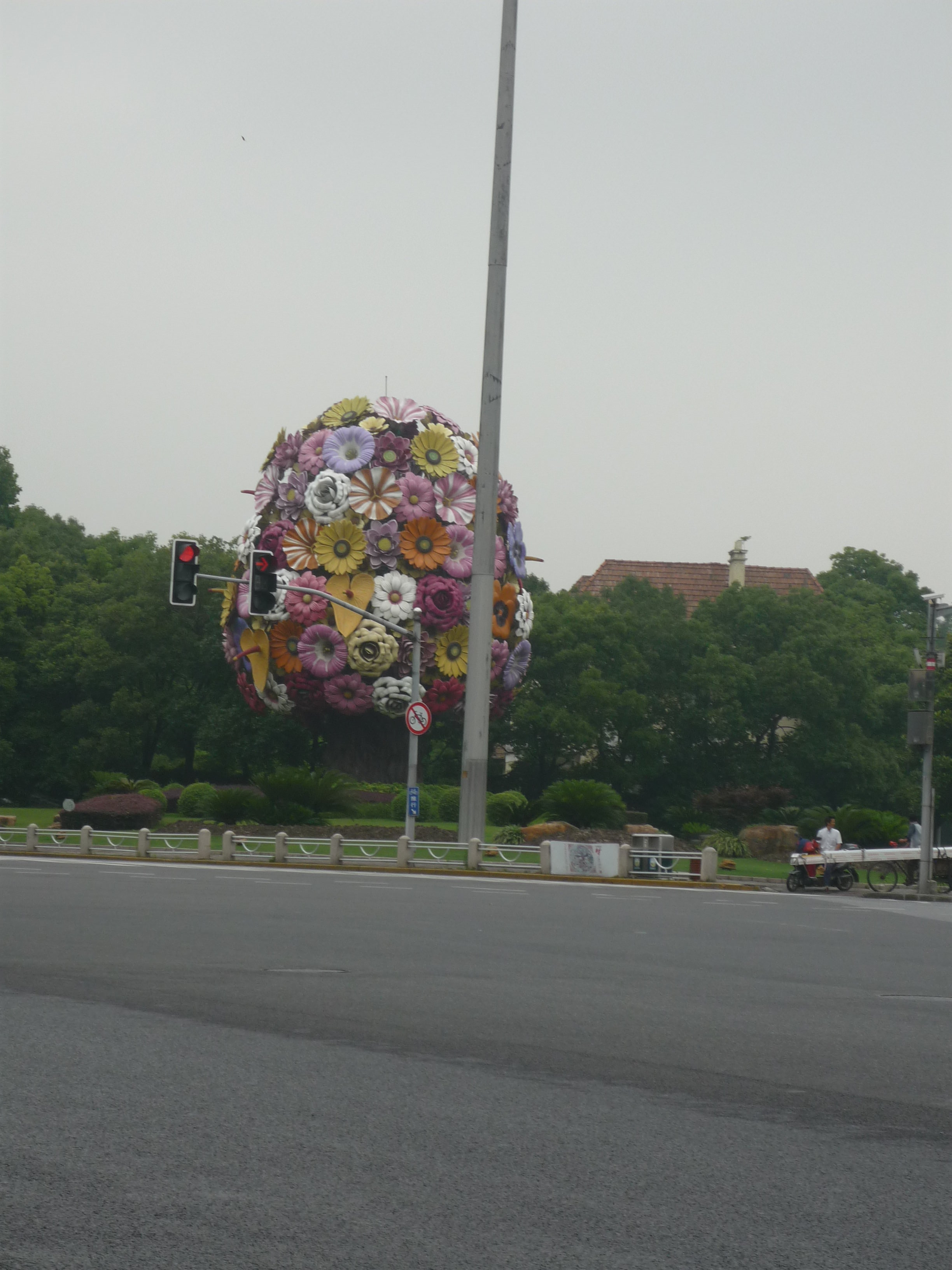 As we left our apartment block we passed, at the entrance, a blinged-up VW Beetle – sorry the picture isn’t very good, but the curtains with the teapot tieback in the window should give you some idea of what else was going on inside the car. Meanwhile outside the compound a little further up the main Gubei Road where it meets the overhead Ya’an Elevated Road – the flyover – and the Ya’an West Road on the ground and the major Hongqiao Road going ENE – SWS in a crazy intersection