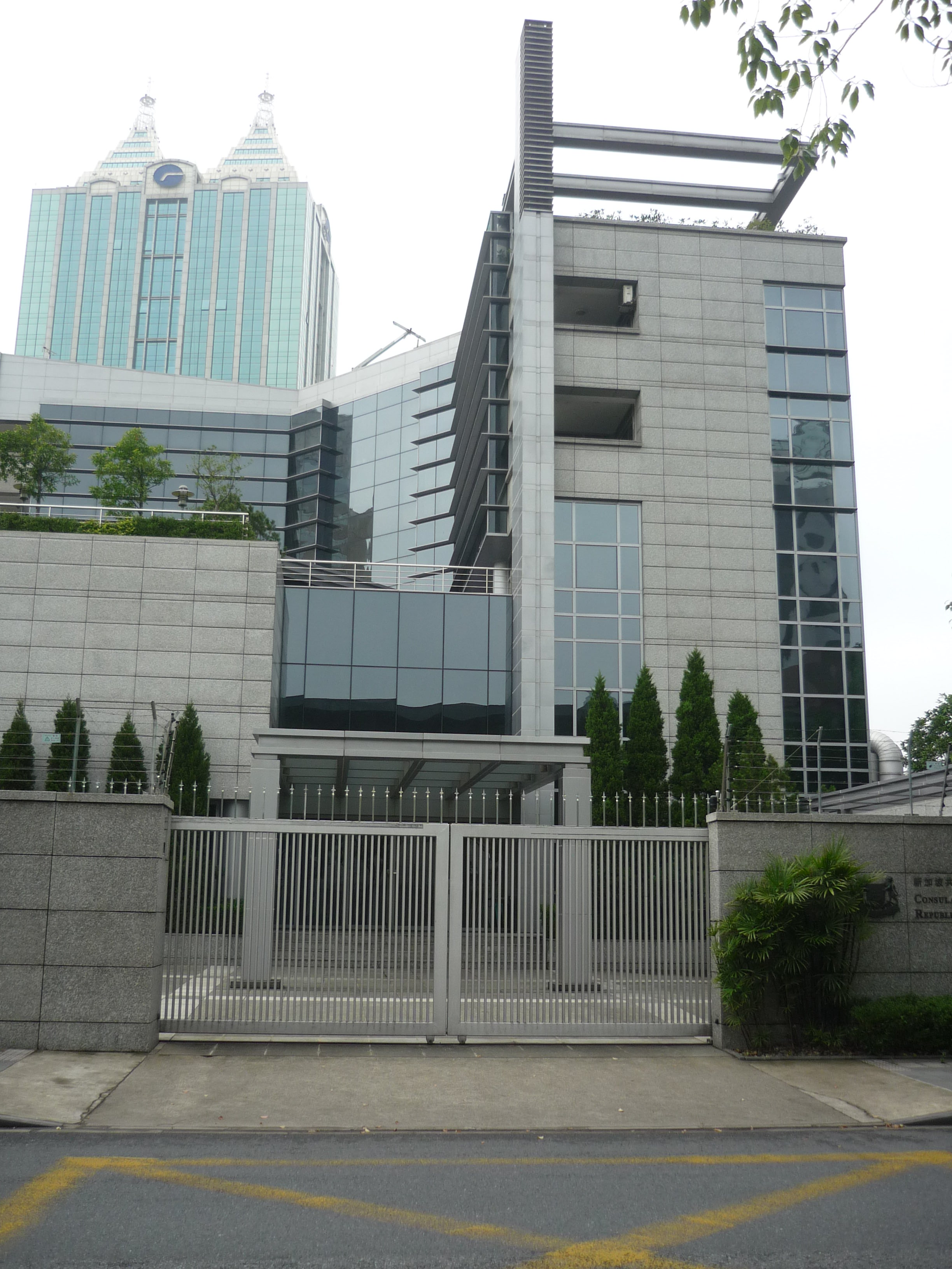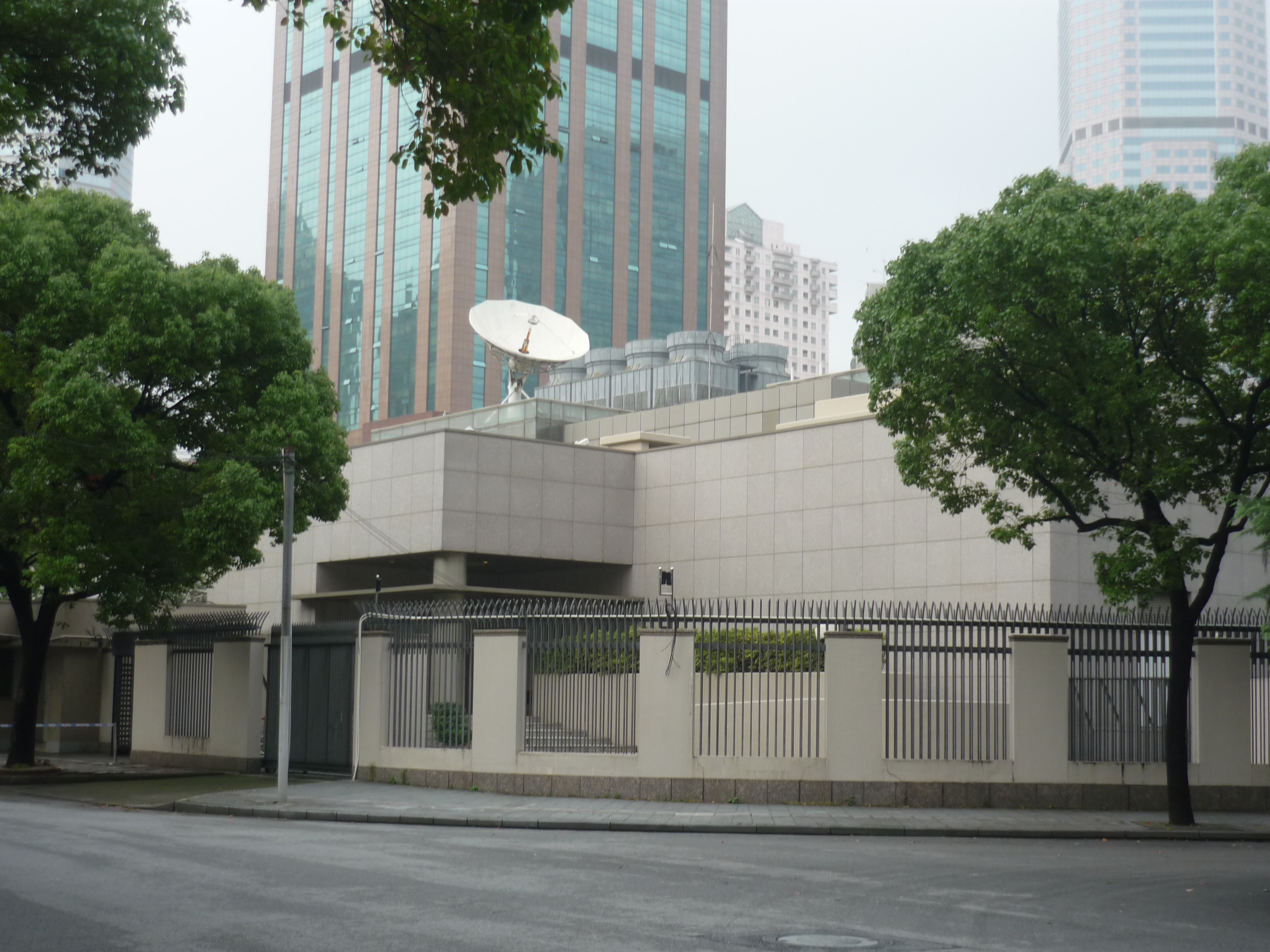 The Japanese Guozong Consulate, was the most like a concrete box, with evident satellite communications equipment on the roof and armed Chinese soldiers at the gates.