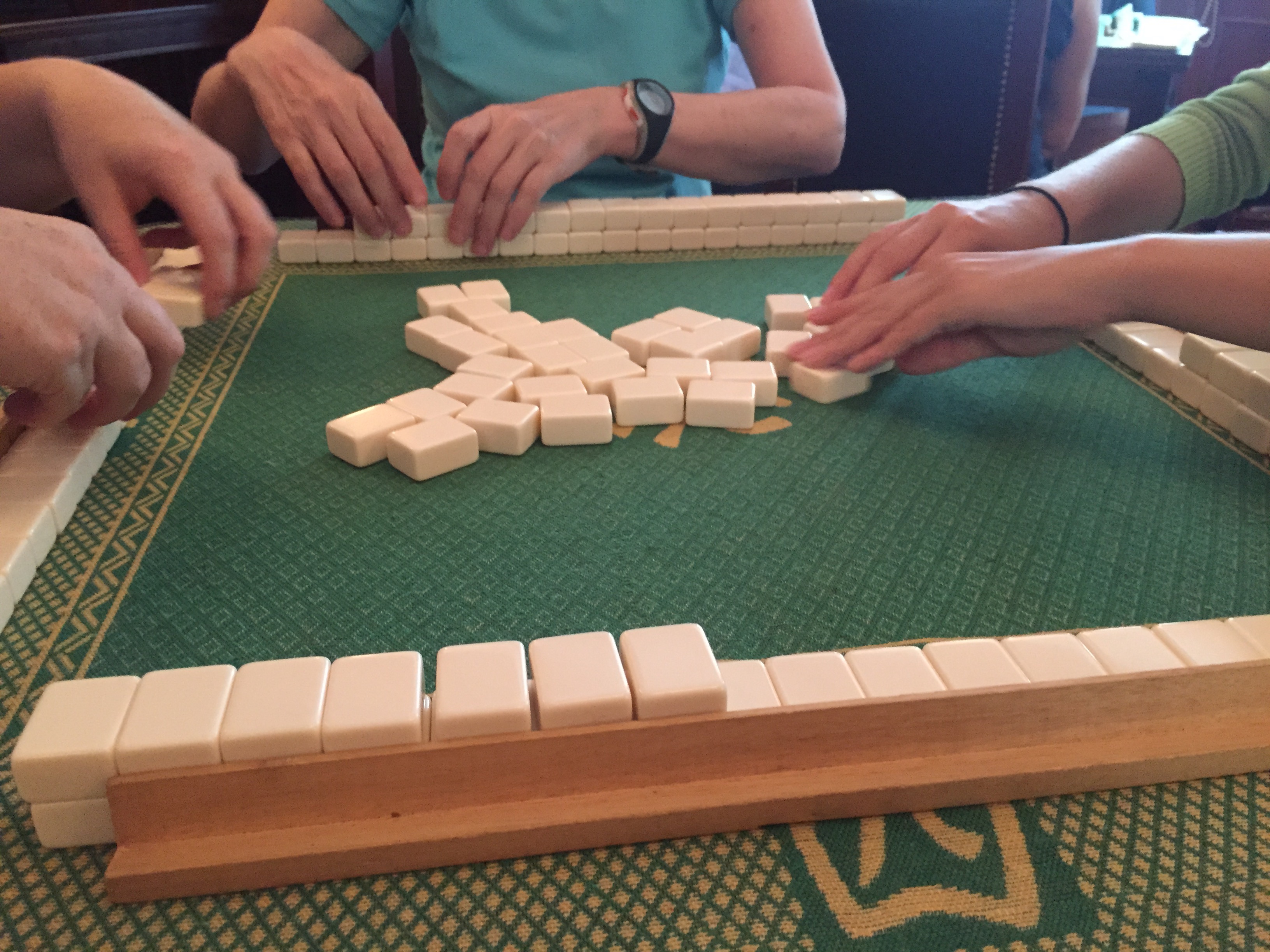 We played open hands to start off with, so that we beginners could all see what everyone had and she could help us make the right decisions on our next move. The tiles are made up of three suits (numbered from 1 to 9) – bamboo, circles and characters. In addition there are the wind (East, South, West and North) and the dragon (Red, Green