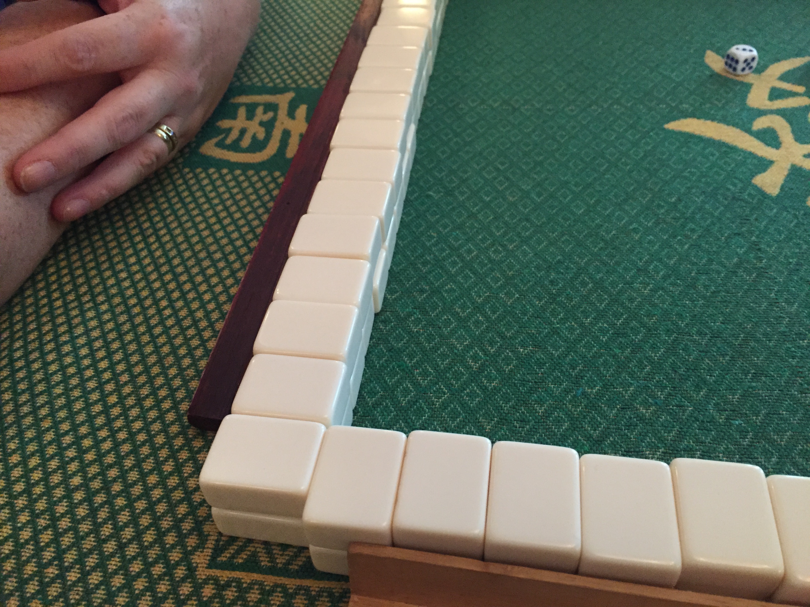 everything starts in the East and goes anti-clockwise. (I’ve wonder whether this has anything to do with geography, or the sun – the position of China to its known world cf the position of the old world relative to its). Another throw of the dice determines where the player East Wind will break the Wall and then collect the players’ tiles distributing 13 tiles to each player who stores them on their rack. (East wind gets an extra tile which is then discarded into the centre at the start of play and has a different coloured rack to denote that they are indeed, East Wind.) The untouched end of the wall is known as the Kong Box (denoted by a stack of tiles) and is the source of extra tiles when for example someone uncovers a season or flower tile.