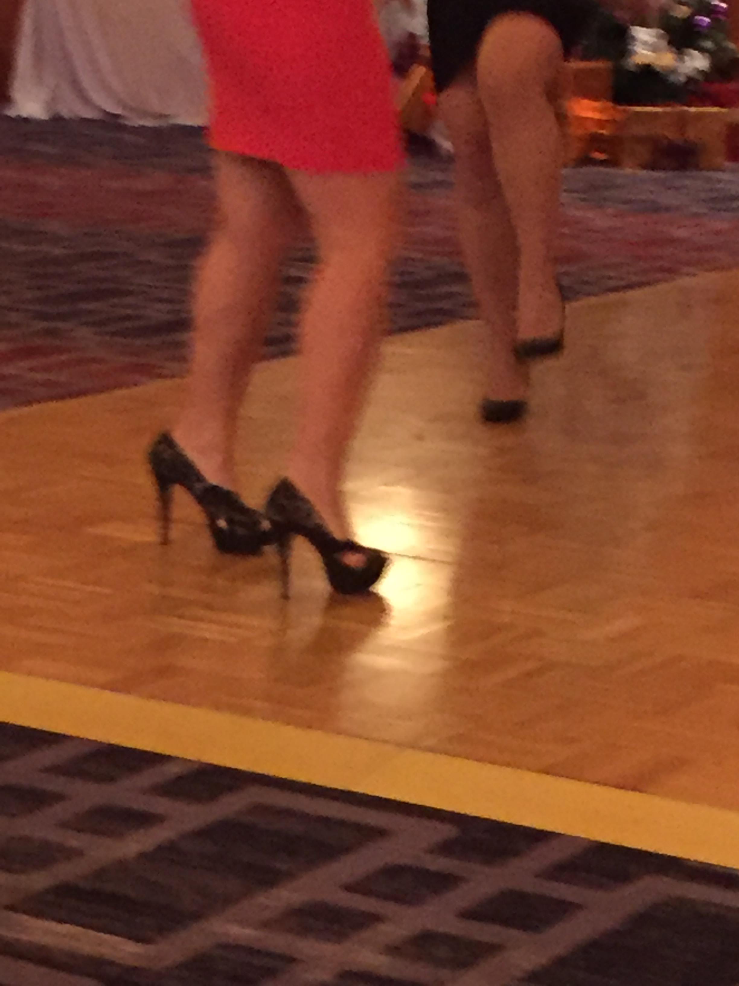 them inside a pair of tights which a nominated person had to wear and dash to the stage to win and then sing…….. There was dancing too – inevitably The Conga, and a bit of standard bopping. I was amused to see the quality of the heels worn – of a stature most impressive, especially those worn by those a little bit vertically challenged. I am glad I’m relatively tall and don’t or won’t climb up onto those things any more…….