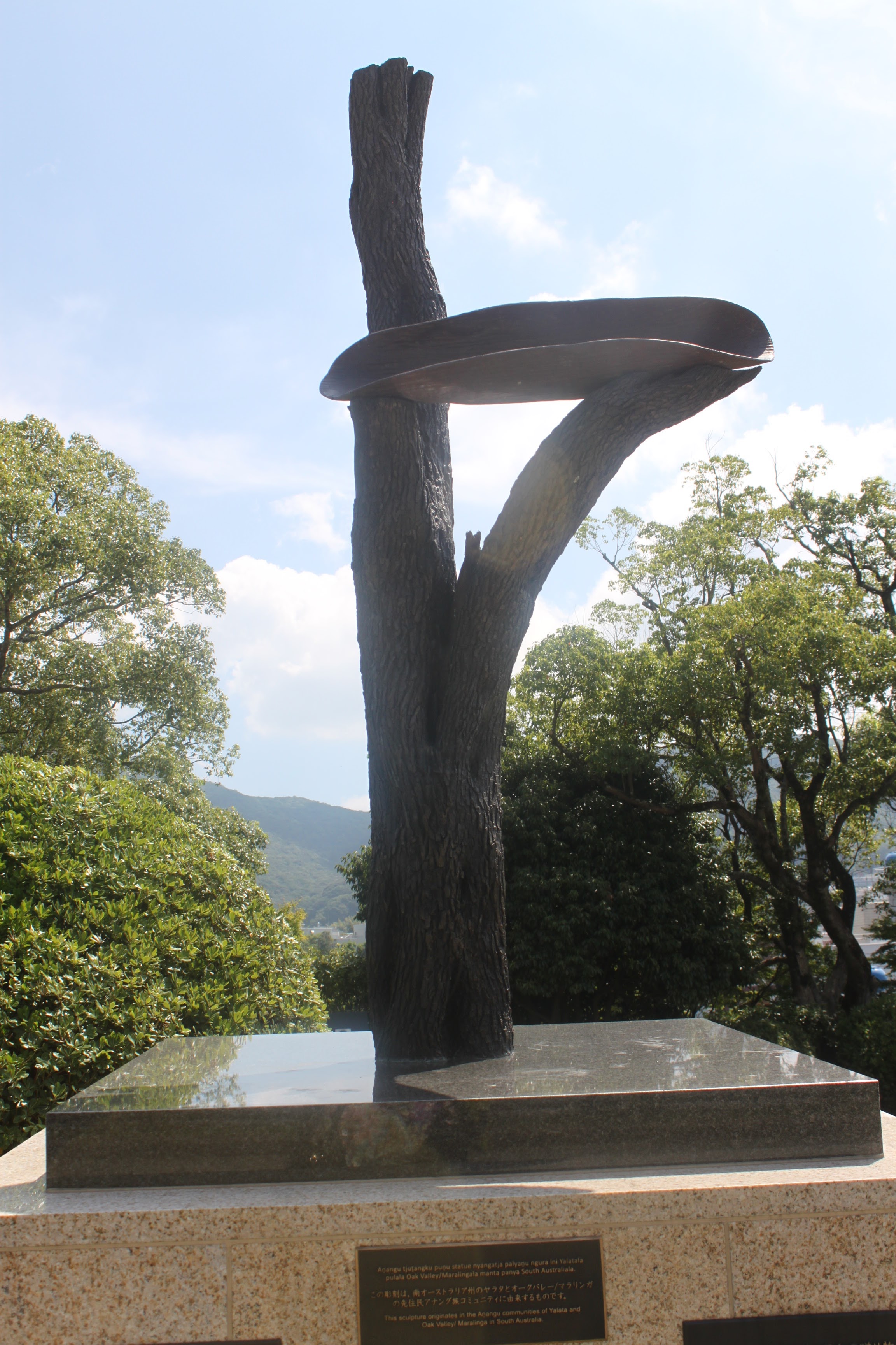 and a symbolic Tree of Life with a Gift of Peace in the form of a piti (dish) used for carrying food, representing the sharing of resources between families, communities and nations for peace and harmony. Gifted by the city of Freemantle, the port of Perth, Western Australia it was sent in recognition of atomic survivors worldwide, including Hibakusha of Nagasaki and Hiroshima; and indigenous Australians, service personnel and civilian workers, and their descendants, affected by British nuclear testing in Australia at Maralinga, Emu Field and Monte Bello Islands.