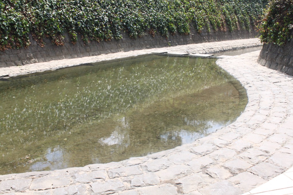 In the aftermath of the bombing this area was strewn with huge amounts of debris from destroyed buildings – melted glass and other material – and scorched earth. The original pre-bomb ground level is preserved within this small park around the stream and pool, as reminder to the amount of debris that lay waste around about.