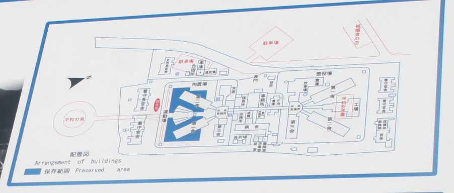 The long thin site on which the Peace Park now sits was the Urakami Branch of Nagasaki Prison when the bomb dropped. The site was 20,000 m2, with its offices covering 13,000 m2. It was located between 100m and 350m north of the hypocentre of the atomic bomb and was the closest public building to the epicentre.
